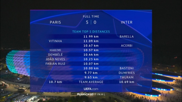 跑动数据显示,登贝莱跑动10.44公里队内第三、全场第五。